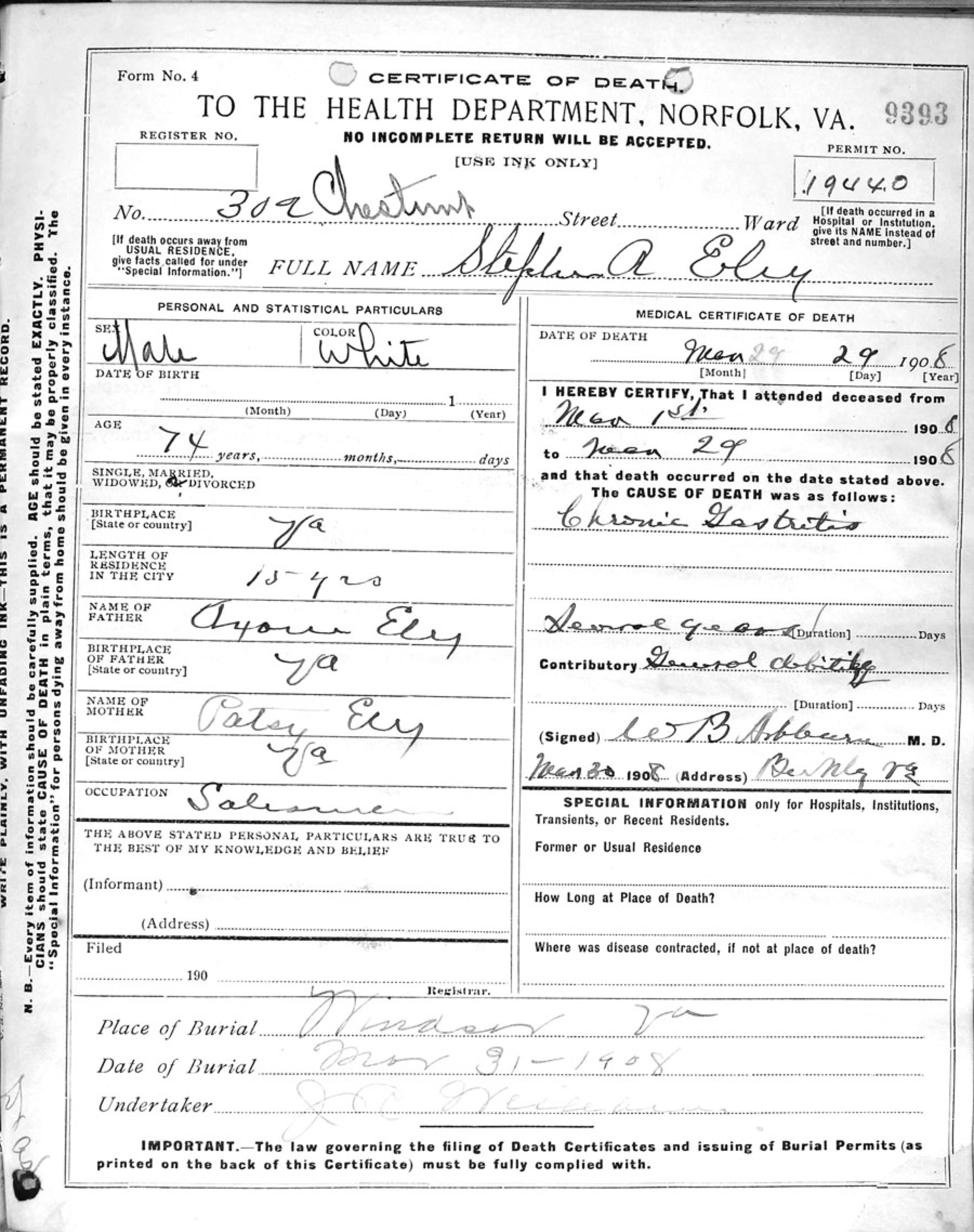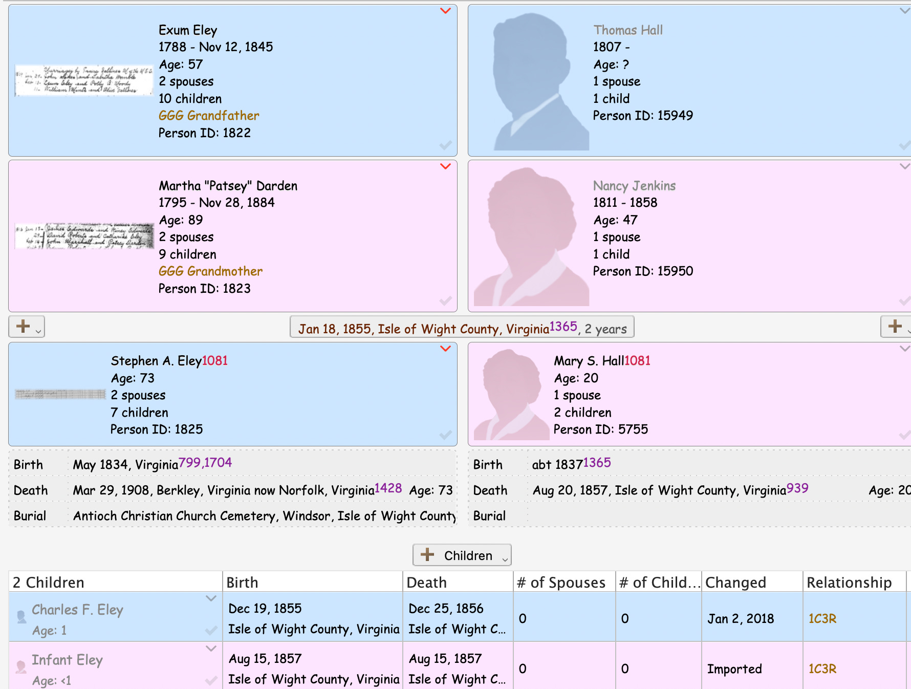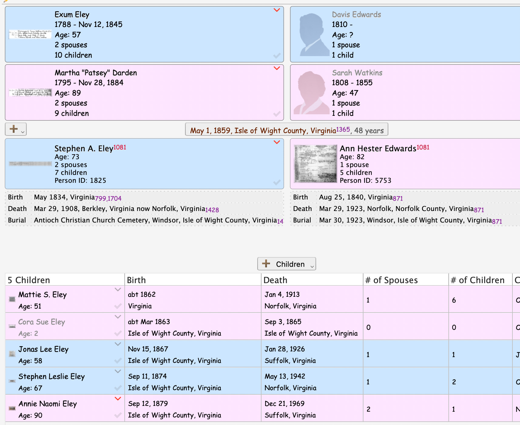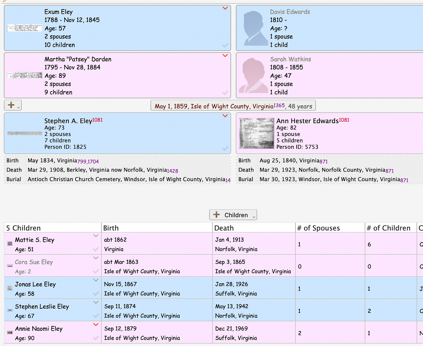Found enumerated on the 1870 US census of Hardy Township, Isle of Wight County, Virginia: Stephen A., age 35, farmer, value of real estate $1000, value of personal property $800, born Virginia; Anne H., age 23, keeping house, born Virginia; Mattie S., age 8, born Virginia; J. W., age 3, born Virginia. Stephen is found on the 1880 US census of Isle of Wight County, Virginia: Stephen A., age 46, farmer, born Virginia, parents both born Virginia; Ann H., age 40, wife, keeping house, born Virginia, both parents born Virginia; Mattie S., age 19, daughter, at home, born Virginia; Jonas L., age 12, son, at school, born Virginia; Stephen W., age 5, son, born Virginia; Ann M (or Mary M., hard to read??), age 9 months, born September 1879, born Virginia. Stephen A Eley in the U.S., Selected Federal Census Non-Population Schedules, 1850-1880 Name Stephen A Eley Enumeration Date 30 Jun 1880 Place Isle of Wight, Virginia, USA Schedule Type Agriculture OS Page 44 Line Number 1 From the Norfolk Virginian, Norfolk, Virginia, published on Jan 6, 1892: “Mr. S. A. Eley, of Isle of Wight county, has removed his family to this city. Mr. Eley is interested in the new market house.” Appears in 1892-93 City Directory for Berkley, (Norfolk County), Virginia: Stephen A., treas. Berkley Market and Stock Yard Co., h 128 Chestnut, also listed at this address is one Hubert S. Eley, pres Berkley Market and Stock Yard Co., and S. Leslie Eley, confr 108 Berkley ave., h 128 Chestnut. Johah L. Eley is listed as sec Berkley Market and Stock Yard Co. h 120 Chestnut (maybe a typo?) 1983-94 city directory for Berkley, Virginia: Stephen A. Eley, salesman h 39 Berkley ave. 1900 city directory for Norfolk, Virginia: Stephen A. Eley, agt Singer Mnfg Co h Berkley, also listed is John L., agt Singer Mnfg Co h Berkley. Stephen appears on the 1900 US census of Berkley Town, Washington Township, Norfolk County, Virginia, as follows: Stephen A., born May 1834, 66 years old, married 40 years, born Virginia, parents both born Virginia, sewing machine agent; Anne H., wife, born Aug. 1841, 58 years old, married 40 years, 4 children, all of which survive, born Virginia, both parents born Virginia; Jonah L. Eley, son, born Nov. 1867, 32 years old, married 4 years, born Virginia, sewing machine agent; Leslie, son, born Sept.1875, 24 years old, single, born Virginia, salesman (groceries); Florence, daughter-in-law, born Feb. 1874, 24 years old, married 4 years, no children, born Virginia, parents both born Virginia. 1902 city directory for Norfolk, Virginia: Stephen A. Eley, salesman Singer Mnfg C h Berkley, also listed are Johan L. Eley, salesman Singer Mnfg Co h Berkley and Stephen L. Eley, trav. salesman 157 Water, h Berkley. 1903 city directory Norfolk, Virginia: Stephen A. Eley, salesman Singer Mnfg Co, h Berkley, also listed are Jno and Stephen L. From the Norfolk Landmark, Norfolk, Virginia, published on May 10, 1903 “Mrs. Mattie S. Johnson and little daughter, of Windsor, Va., are the guests of the family of Mr. S. A. Eley on Chestnut street.” 1904 city directory, Norfolk Virginia: Stephen A. Eley, trav salesman, The Singer Mnfg Co, h Berkley. Stephen L. is also listed. 1905 city directory, Norfolk, Virigina: Stephen A. Eley, salesman Singer Mnfg Co., h Berkley Found on 1908 directory of Norfolk, Virginia: Stephen A. Eley, agt Singer Machine Co., h. 302 Chesnut, B.; also at this address are found Miss Annie N. Eley and Stephen L. Eley, trav saleman A. Brinkley & Co. Not found on 1909 directory of Norfolk, Virginia, although his son Stephen L. is found in that year. His wife Ann H. is listed in the 1910 city directory of Norfolk, Virginia. Ann is also listed on the 1910 census in her son’s household as a widow. Stephen A Eley in the Virginia, U.S., Death Registers, 1853-1911 Name Stephen A Eley Gender Male Race White Marital Status Single; Married; Widowed; Divorced (Single) Age 74 Birth Date abt 1834 Death Date 29 Mar 1908 Death Place Norfolk, Virginia, USA Cause of Death Chronic Gastritis Father Axone Ely Mother Patsy Ely