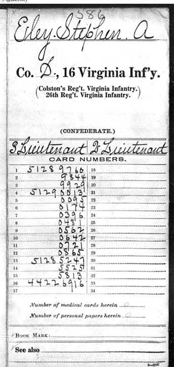Stephen A. Eley in the Virginia, U.S., Select Marriages, 1785-1940 Name Stephen A. Eley Gender Male Marital Status Single Age 25 Birth Date 1834 Birth Place Isle of Wight, VA. Marriage Date 01 May 1859 Marriage Place Isle of Wight, Isle of Wight, Virginia Father Ecum Mother Martha Spouse Ann H. Edwards FHL Film Number 32020 Reference ID P 6 In 21 * *No copy of the marriage record in my file. Stephen is enumerated on the 1860 census of Isle of Wight County, Virginia as follows: Stephan A., age 25, school teacher, value of personal property $350., born Virginia; Anne H., age 19, born Virginia. Stephen A. Eley in the Virginia, U.S., Compiled Census and Census Substitutes Index, 1800-1890 Name Stephen A. Eley Residence Year 1860 Residence Place Eastern District, Isle of Wight, Virginia Title Va 1860 Slave Schedule Served in 16th Virginia Infantry with his brother Solomon. According to the history of the 16th VA Infantry, Company D, as found on the internet, Private Stephen Eley was a prisoner of war, taken September 14, 1862 at the Battle of Crampton’s Gap, Maryland. He was also listed as a deserter on October 2, 1863. Stephen A Eley in the U.S., Confederate Soldiers Compiled Service Records, 1861-1865 Name Stephen A Eley Age 27 Birth Year abt 1834 Enlistment Date 1861 Military Unit Sixteenth Infantry (Colston’s Regiment, Infantry; Twenty-Sixth Regiment, Infantry) * Compiled service record cards file is 39 images long, here is the first page. Complete file can be found at Fold3.